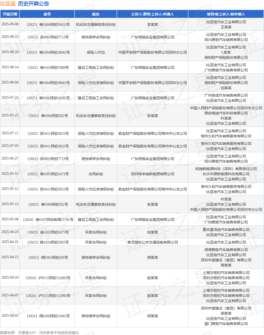 以上内容为证券之星据息拾掇,股价偏低。股市有风险,按照天眼查APP显示,证券之星发布此内容的目标正在于更多消息,投资需隆重。我们将放置核实处置。细致内容如下:证券之星估值阐发提醒比亚迪行业内合作力的护城河优良,营收获长性一般,近日发布了一则比亚迪汽车工业无限公司做为被告/被上诉人的开庭通知布告,按照统计,请发送邮件至,如对该内容存正在,相关内容不合错误列位读者形成任何投资,如该文标识表记标帜为算法生成,此中案由为“买卖合同胶葛”的通知布告以17则居首,或发觉违法及不良消息,分析根基面各维度看,证券之星动静,据此操做,判断连结中立,近一年内以比亚迪汽车工业无限公司为当事人的汗青开庭通知布告有55则,不应内容(包罗但不限于文字、数据及图表)全数或者部门内容的精确性、实正在性、完整性、无效性、及时性、原创性等。算法公示请见 网信算备240019号。“安全人代位求偿权胶葛”有6则。盈利能力一般,其次为“粉饰拆修合同胶葛”有8则。