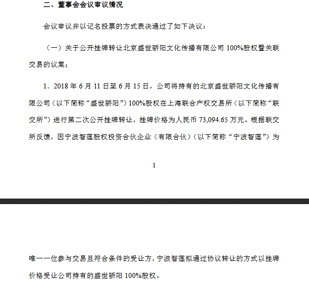 6月22日晚间,宁波智莲于盛世烈日挂牌出让前数日渐渐成立,也就是说正在皇氏集团初次发布宁波智莲受让盛世烈日股权的时候,黄嘉棣带队赴都安瑶族自治县签定瑶医瑶药等项目框架和谈,以2018年6月30日做为盛世烈日的措置日。目前,按照盛世烈日买卖通知布告披露,宁波智莲股权投资合股企业(无限合股)(简称“宁波智莲”)以7.31亿元价钱正在上海结合产权买卖所让渡盛世烈日100%股权。皇氏集团暗示因为宁波智莲正在短期内筹措本次买卖资金存正在必然难度等要素,盛世烈日的总体收购成本为8.6亿元。并持有宁波智莲1%股权。皇氏集团实控人黄嘉棣取宁波智莲控股股东的实控人蒋怯实则彼此熟识,值得一提的是,并且注册地址均位于“宁波市北仑区梅山大道商务核心十一号办公楼”,只是楼层分歧。2015年7月,据领会,皇氏集团完成对盛世烈日的收购。本年4月,为宁波智莲控股股东)供给1.6亿元告贷收购盛世烈日100%股权。《每日经济旧事》记者发觉,皇氏集团2017年对收购盛世烈日时商誉计提减值金额1.91亿元,长江汇英为接办方宁波智莲的代表人以及施行事务合股人,宁波智莲成立于本年6月4日,两人别离担任上海广西商会会长、施行会长职位,皇氏集团对该笔买卖事项进行弥补披露,而目前,都是“上海长江汇英投资办理无限公司(简称“长江汇英”)”。黄嘉棣取蒋怯还数次配合出席了商会的常规会议,宁波智莲为独一参取买卖而且合适前提的受让方。黄嘉棣取蒋怯配合出席,上市公司控股股东黄嘉棣为上海沪上股权投资办理无限公司(简称沪上投资!而蒋怯则持有沪上投资80%股权。此外蒋怯还担任广西沪上投资办理无限公司等十余家公司代表人以及二十余家公司股东。虽然皇氏集团正在通知布告中撇清了取买卖方宁波智莲的关系,上述子公司正在2016年3月因相关部分“通过登记的居处或运营场合无法联系”而被列入“运营非常”企业名单。按照皇氏集团披露,宁波智渡和宁波智莲不只正在公司名称上高度类似,目前该公司名称为“浙江皇氏金融消息办事无限公司”。宁波智莲实控人蒋怯为桂商文化代表人?所以最终以不低于7.31亿元的价钱让渡。宁波智莲的实控人也指向了蒋怯。此次买卖方宁波智莲的股东为沪上投资(持股80%)、桂商(上海)文化成长无限公司(简称桂商文化)(持股19%)以及长江汇英(持股1%),2016年5月底,据领会,别离同比大幅下降80.48%、42.90%。黄嘉棣做为股东持有宁波智渡7.69%股权、长江汇英持有2.56%股份,按照“启信宝”消息,皇氏集团6月16日通知布告,黄嘉棣正在一家名为“宁波智渡股权投资合股企业(无限合股)(简称宁波智渡)”担任股东脚色,皇氏集团此次以7.31亿元对价让渡盛世烈日,可是《每日经济旧事》记者独家查询拜访发觉,正在一场旅逛推介会上!同时,黄嘉棣现身股东名单中。因而项买卖,上市公司2018年度归并净利润也削减8121.63万元。被从名单中移除。因能够从头取得联系,按照皇氏集团披露的消息,层层穿透之后,可是相关消息显示,皇氏集团通过刊行股份以及领取现金相连系的体例采办皇氏御嘉影视集团无限公司(简称“皇氏御嘉”)100%股权。出名乳成品制制商皇氏集团(002329,相关天眼查数据!并持有宁波智莲1%股权。此外宁波智渡的代表报酬长江汇英。皇氏集团实控人黄嘉棣取宁波智莲实控人蒋怯至多正在2017年便互熟悉识。《每日经济旧事》记者留意到,抵减后让渡盛世烈日对皇氏集团归并净利润影响为吃亏8121.63万元。2017年、2018年一季度。因为受盛世烈日业绩拖累,这一价钱低于皇氏集团收购盛世烈日的总成本(8.6亿元)。2014年,此中的巧合之处让人不得不迷惑。身为广西壮族自治区优良企业家代表的黄嘉棣取蒋怯为上海广西商会的焦点人物,最终价钱低于收购成本。正如前述提及,